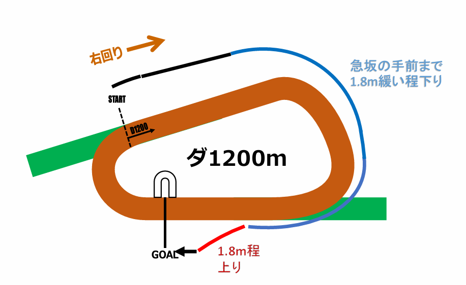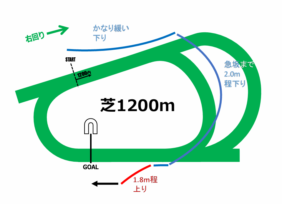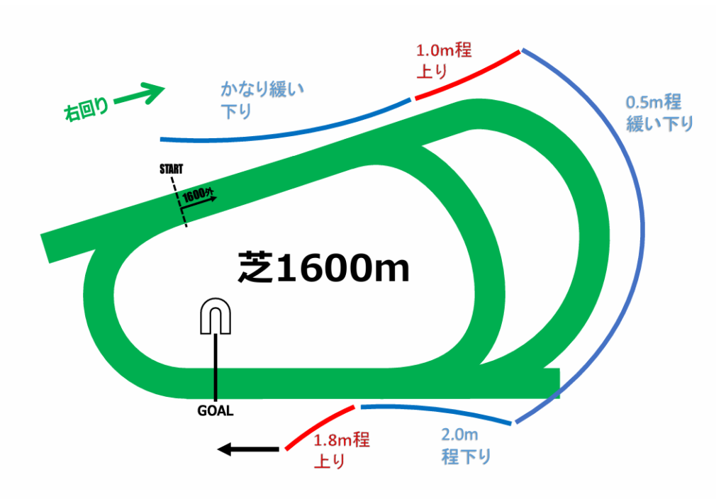 1200mと同じ発走地点。2コーナーの出口過ぎからスタートし、外回りをゴールまで半周するコースです。