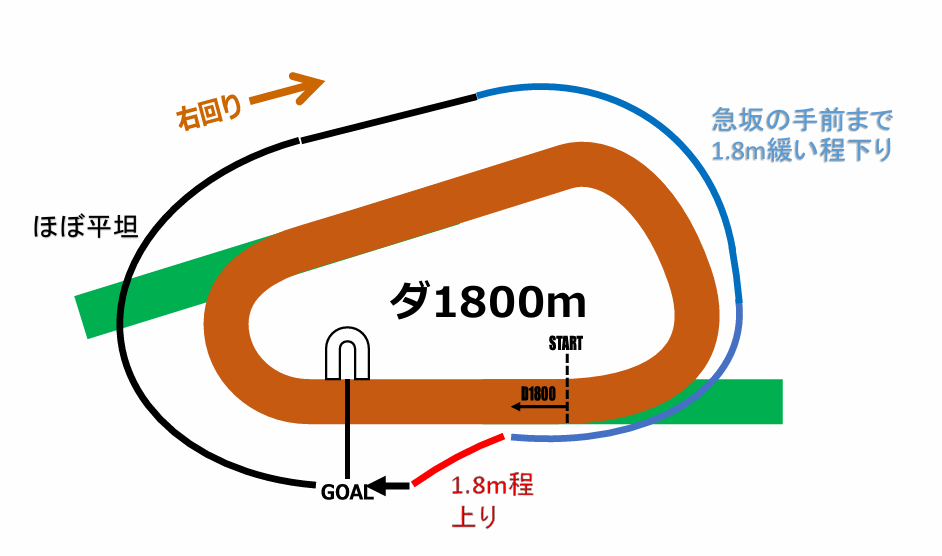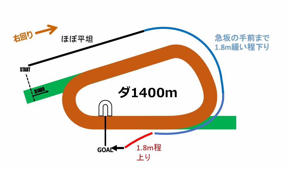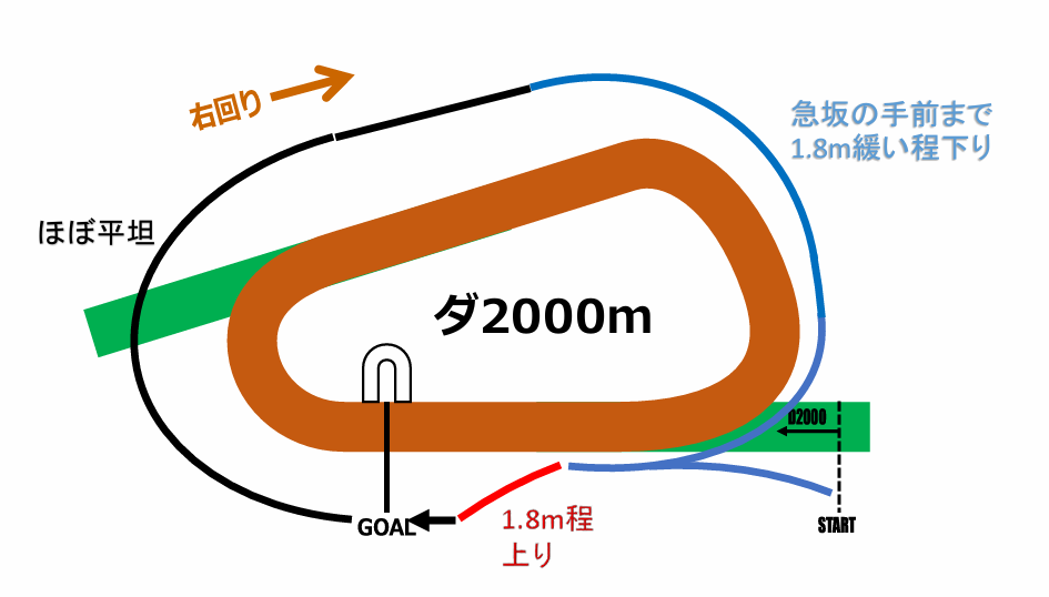 4コーナーのポケット、芝部分からスタートし、急坂を2回通ってゴールまで1周半する非常にタフな中距離ダートコース。