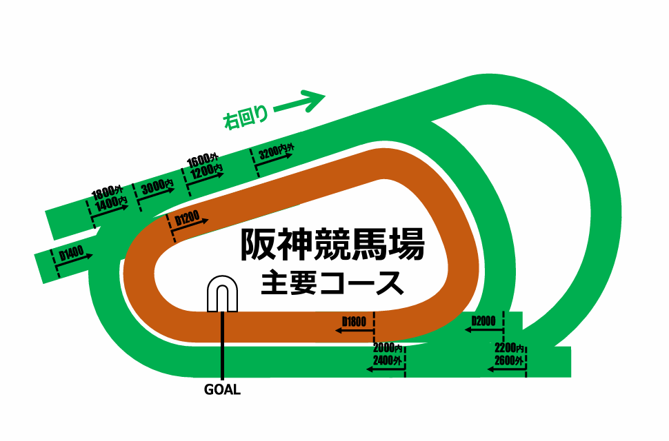 阪神競馬場は、芝コースは内回りと外回りの2種類あり、ダートは内回りのみのコースになります。