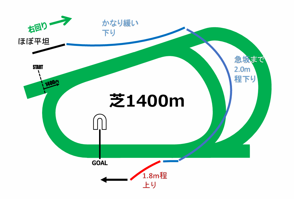 1400mと同じ発走地点。2コーナーのポケットからスタートし、外回りをゴールまで半周するコース。