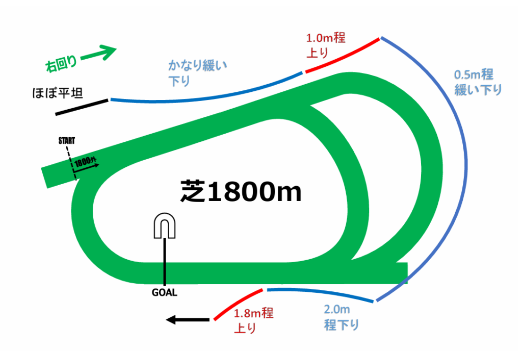 展開面では、芝スタートや初角まで543.6mと距離が長いため、上級条件ではハイペースになりやすく、逃げ馬は不利に、差し馬の方が有利になるケースも出てきます。