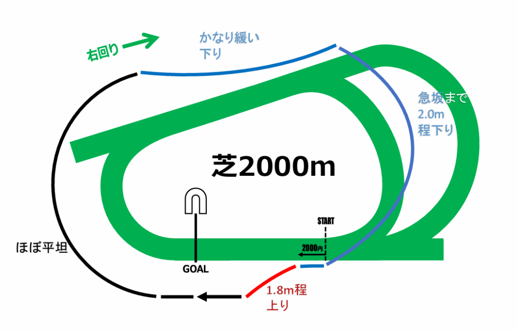 2000mと違い、スタート後の急坂まで距離が伸びる点と初角までの距離が530.5mと非常に長くなる点から、前半のペースは速くなりやすいのが特徴です。