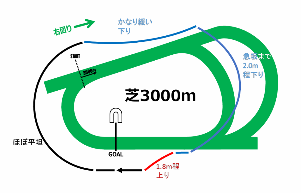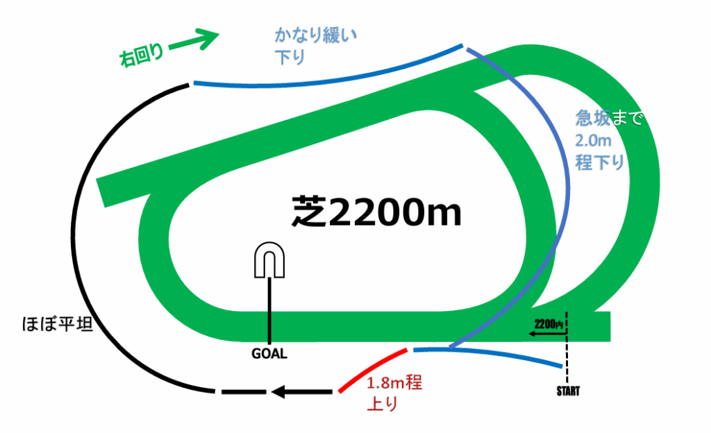 スタート直後に緩やかな下り坂があるため、長距離コースの中では前半から比較的ペースが上がりやすく、内回りコースで3コーナーから早仕掛けになる傾向もあり、非常にタフなロンスパ戦に。逃げ馬は基本的に不利になりやすいのが特徴です。