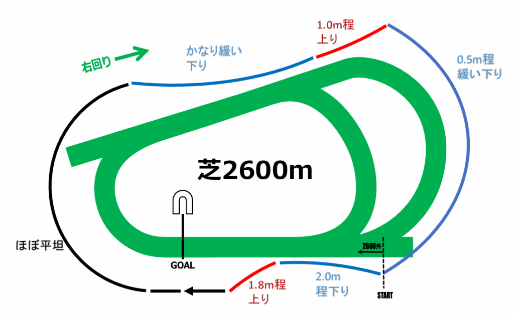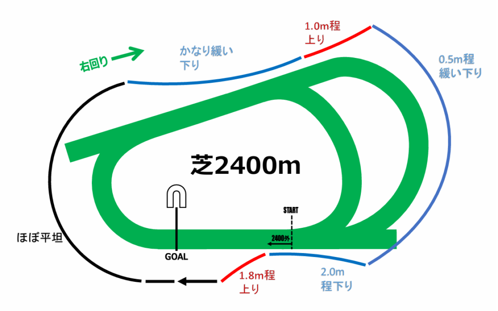2200mと同じ発走地点。4コーナー出口付近の下り坂からスタートし、急坂を2回通って外回りをゴールまで1周するコースです。2400mよりもさらにタフな外回りになります。