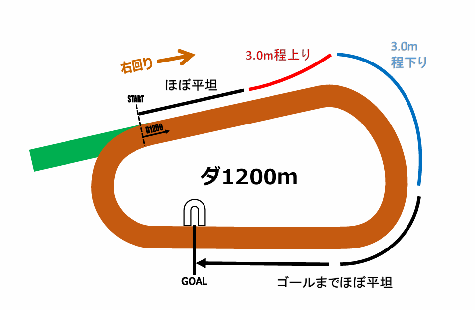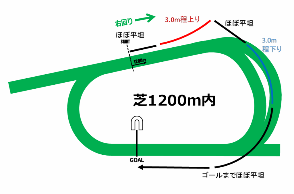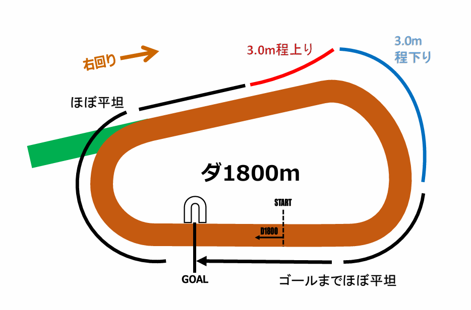 初角までの距離が911.7mと、新潟の千直並みの直線を走り3コーナー手前の上り坂へ向かい、外回りで4コーナーまで下り、平たんな正面の直線をゴールまで走るコースレイアウトです。