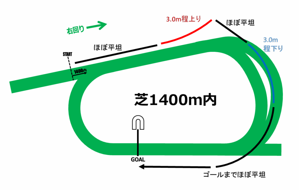 向正面の上り坂手前からスタートして内回りを半周するコース。3コーナーで最高点になり、そこから4コーナーまで一気に下り、ゴールまでは平たんな直線が続きます。