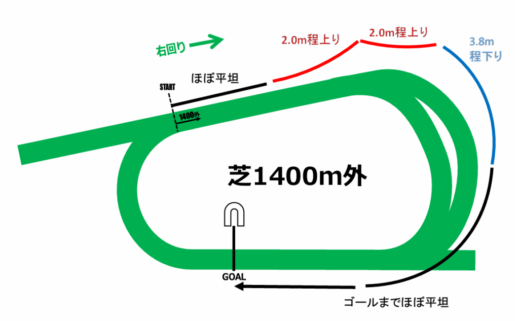 そこからは1400m内回りと同じく中間上り坂でペースが緩んで好位・中団の差し馬がポジションを上げやすく、3コーナー下り坂からの加速で差し切りやすいコースレイアウトになっています。