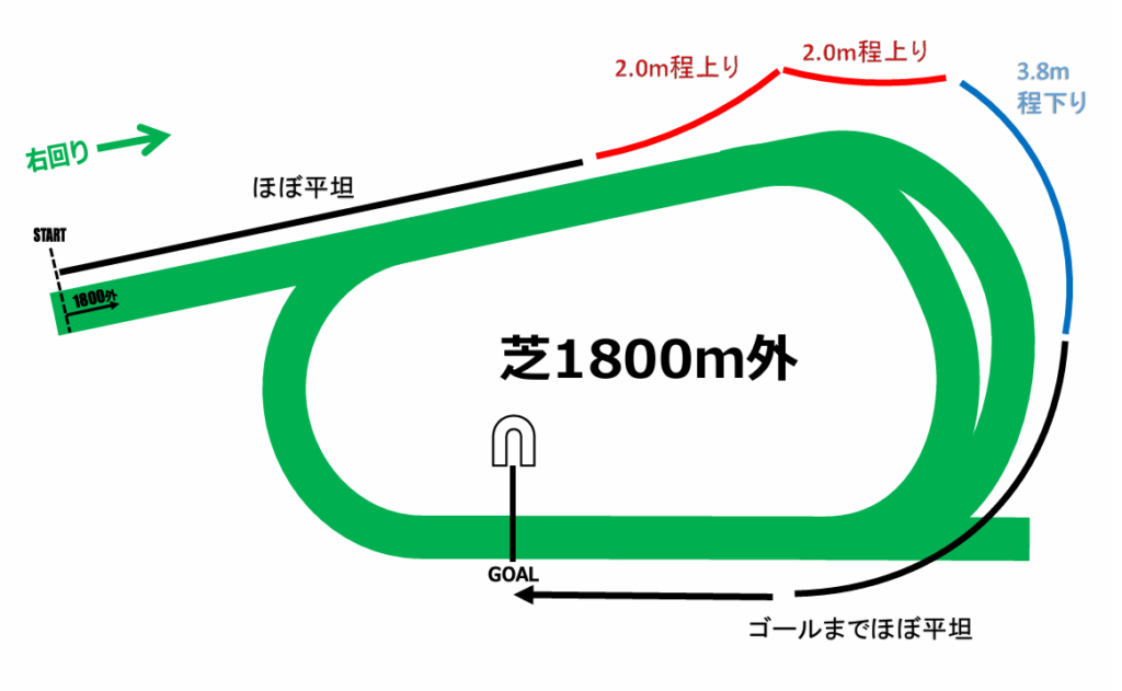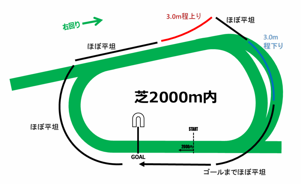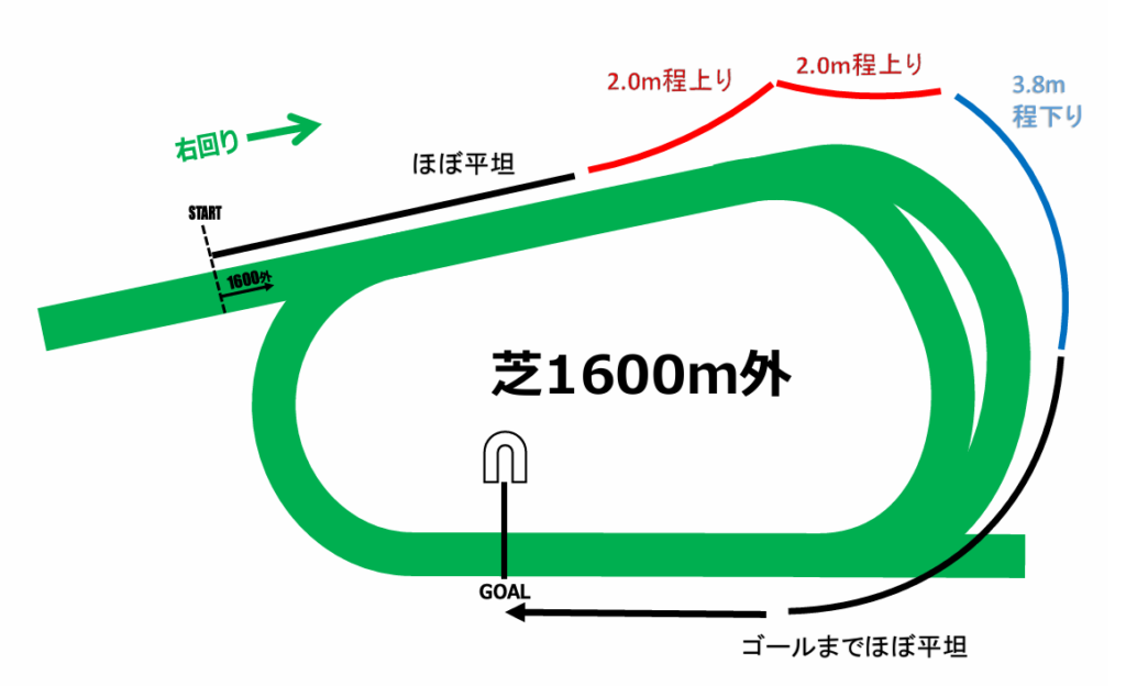 基本的には1600m内回りと同じコースレイアウトですが、3コーナーでの高低差がさらに1m程度高くなることでさらに末脚重視の傾向になっています。