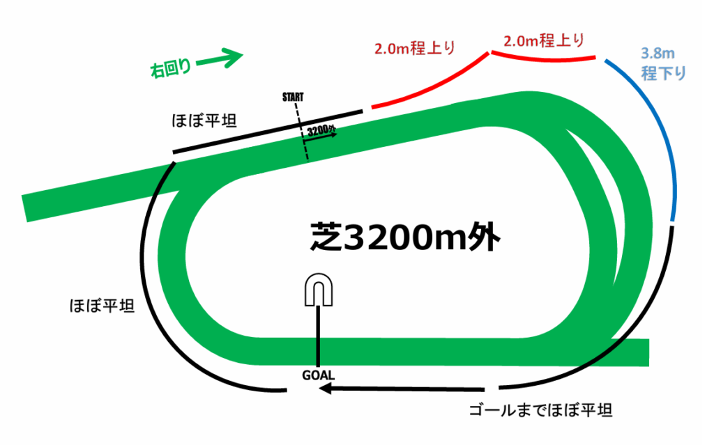 スタートから3コーナーの手前までは同距離の内回りコースと同じ傾向ですが、外回りになり3コーナーでさらに1m高低差が上がります。